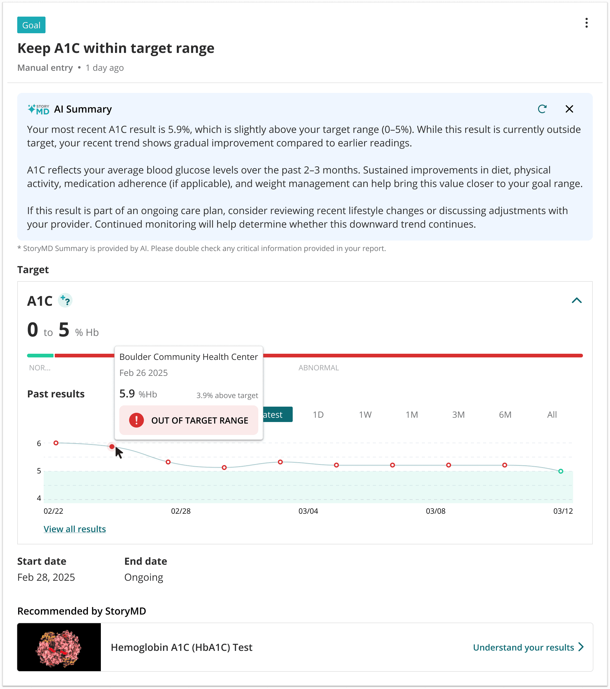 Users could generate AI summaries for individual test results. Summaries referenced structured health content from the library and, where relevant, connected to trends within the PHR.