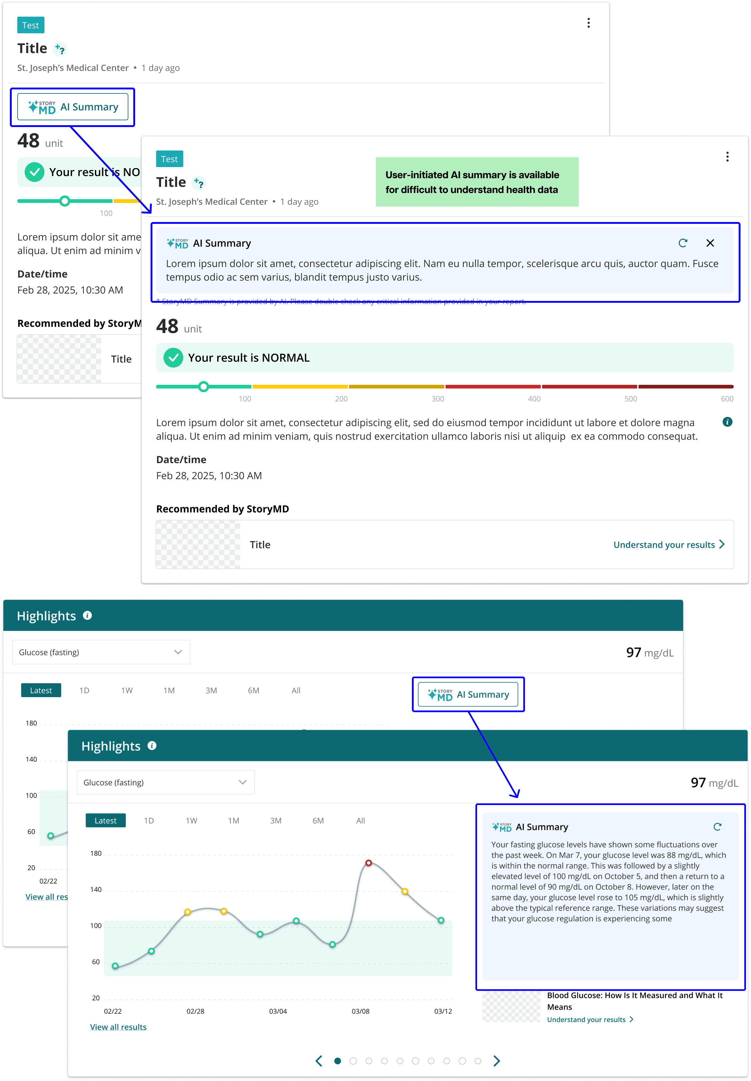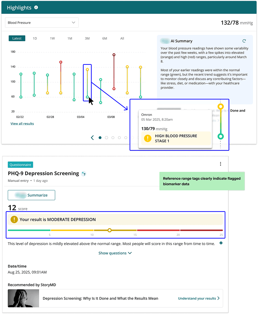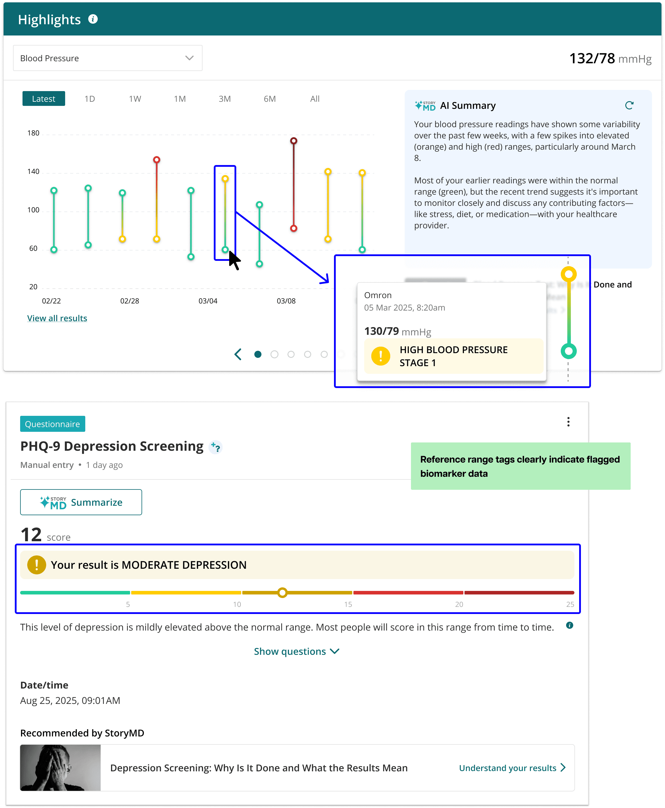 StoryMD’s PHR allowed users to aggregate lab results, wearable metrics, and clinical records. However, raw data alone did not provide clarity. Users were required to interpret numeric results, reference ranges, and trends without contextual guidance.