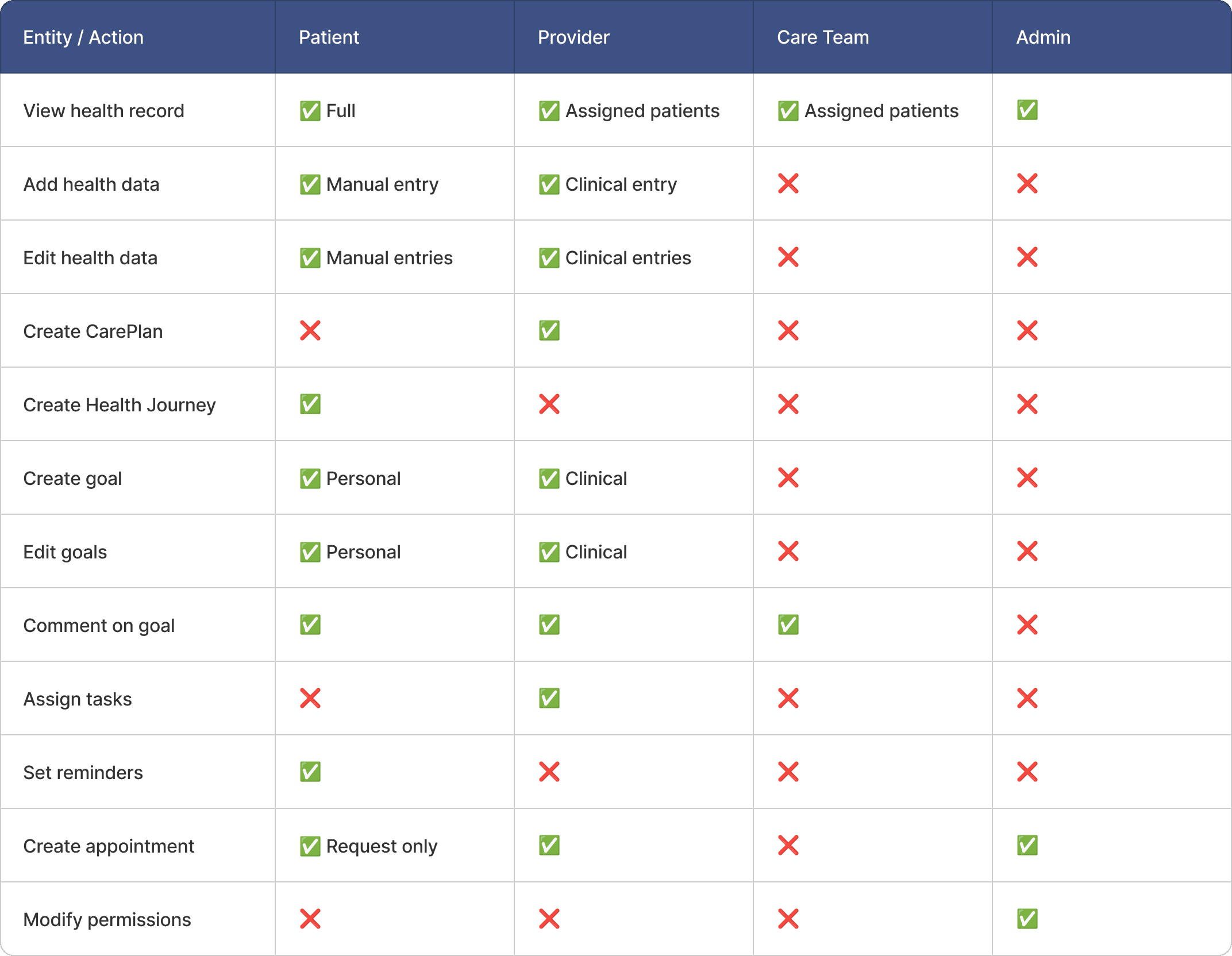 A role matrix was defined to map permissions across patient, provider, and administrative roles. Access was scoped by data type, action, and ownership.