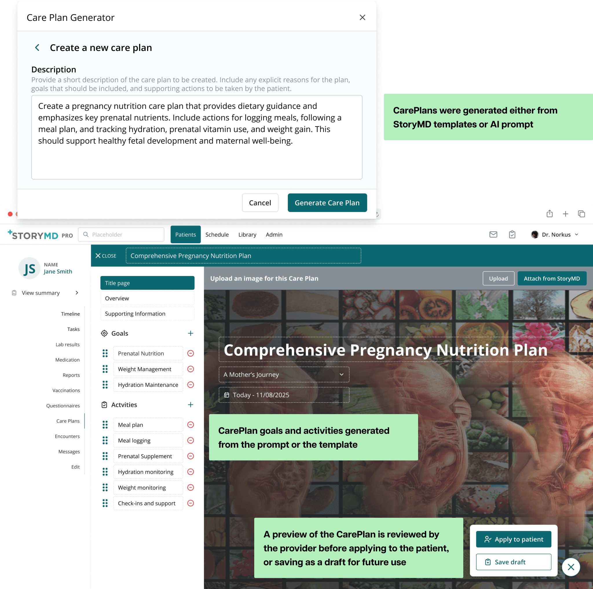 As clinical objects, the CarePlan object was created by the provider from StoryMD templates or prompting the AI agent trained specifically to build CarePlans.